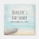 Baby shower eller födelsedagsmagnet med vacker rustik bild. Subtila färger i ljust blått, sandigt brunt och mjukt vitt. En strandscen med en båt på stranden med ett fisknät som hänger över sidan. En elegant shabby look.