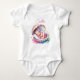 Personlig baby-t-shirt i ett stycke för flickors babyfest, skaffa en till alla i familjen så att de känner sig speciella. Söt mjuk pastellrosa, korall, teal, blå och guld kustnära sjötema baby shower tema. En liten babyflicka som sover inuti en snäcka och guld sjöskal. Vackra fantasifulla akvarelltropiska blommor. Akvarell sjöhästar, sanddollar, tropiska blommor och sjöstjärna.