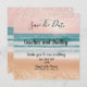 Meddela din speciella dag med detta eleganta strandtemade "Save the Date"-kort. Med ett havsinspirerat formspråk och accentuerat med rosa glitter längst upp och längst ned sätter detta kort tonen för en kustnära ceremoni eller en destinationbröllop. Det skimrande rosa glitret ger en touch av glamour och sofistikation, vilket gör det perfekt för dem som drömmer om ett bröllop vid havet. En innerlig hälsning på baksidan ger en personlig touch och säkerställer att dina gäster sparar datumet för din förtrollande havsutsiktsfirande.