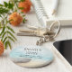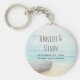 Bröllop tackar dig för nyckelringen med en vacker, rustik bild. Diskret färg av ljusblått, sandbrunt och milt vitt. En strandscen med en båt på stranden med ett fiskenät hängande på sidan. En elegant ska se ut.