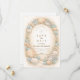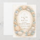 En förfinad kustbröllopsdesign med en elegant oval krans av snäckor, ostronskal, sjöstjärnor och mjuka havsglasaccent. Neutrala sandiga nyanser smälter samman med dämpade havsblå och ömt gräs för att skapa en lugn kustestetik. Den varma pergamentbakgrunden förstärker de naturliga texturerna samtidigt som den bibehåller en tidlös, förhöjd känsla. Perfekt för en romantisk strandfirande med klassisk kustcharm.