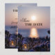 Ett romantiskt vinterbröllop Spara datumkortet med en solnedgång i havet med en fin lantern med mousserande ljus.