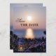 Ett romantiskt vinterbröllop Spara datumkortet med en solnedgång i havet med en fin lantern med mousserande ljus.