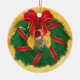 Den här söta chipmunken med en julhatt håller på att ta sig ut bakom en helgrön julkrans med rött band och guld och en stor röd båge för att önska dig "helgdagar" för säsongen.
