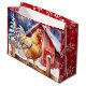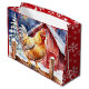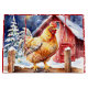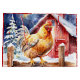 Klar julklapp med en vattenfärgad kyckling från stil som står vid ett rostfritt trästängsel framför en lada. Siderna är tegelrött med vitt snöflingor.