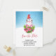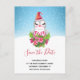 Spara datumet för julvykortet i party med en söt och vismisk design med en vacker penguin med en röd, grym hatt. Stående bakom en blombukett med rosa och vita stripade polkagrisar. En snövinter med snöflingor som faller.