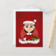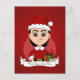 Ett vykort med en illustration av en söt, leende varskaukasisk flicka med svart hår från kort, flickan bär en Jultomten-dräkt med röd hatt och håller en present, i en röd cirkel på röd bakgrund, med en redigerbar textmall för ditt namn eller meddelande
