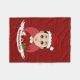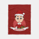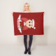 Kasta filt med en illustration av en söt leende kaukasisk pojke med svart hår från kort, pojken bär en Jultomten-dräkt med en röd hatt och håller kvar en present. I en röd cirkel på en röd bakgrund, en juldesign med en redigerbar textmall för ditt namn eller meddelande