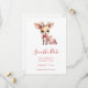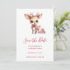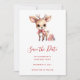 Spara datumkortet med en illustration av ett vackert baby-hjort. Stora ögon med stort öron med stort huvud och små bruna antenner. Med en stor röd båge. Stå bredvid en stapel av gåvor.