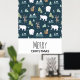 En poster med ett vismiskt festligt mönster. Polar, renar, träd, rävar och snöflingor. Mörk grönt.