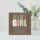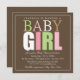 Den här designen har ord"flicka" i färglösa pastellfärgade brev på en brun bakgrund. Barnduschdetaljer sitter nedanför i vitt.