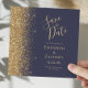 Det moderna bröllop spara datum-kortet från elegantens lämnat kant har ett guld faux glitter gräns. Anpassadet kombinerar handskrift, rityta och kursivt typsnitt i blek guld-färgad med mörk blått bakgrund. Den omvända sidan har en passande mörk blått och guld-design.