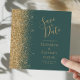 Det moderna bröllop spara datum-kortet från elegantens lämnat kant har ett guld faux glitter gräns. Anpassadet kombinerar handskrift, rityta och kursivt typsnitt med guld-färgad mot en mörk grönt bakgrund. Den omvända sidan har en matchande grönt- och guld-design.
