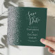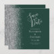Det moderna bröllop spara datum-kortet från elegantens lämnat kant har ett silver faux glitter gräns. Med anpassadet kombineras handskrift av silver grått, tryckplåt och kursivt typsnitt på en mörk med bakgrundsbild av grönten. Den omvända sidan har en matchande grönt- och silver-design.