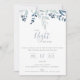 Kvällen före, bröllopsrepetitionsfirande inbjudan. Kortet har en elegant trädgårdsblomsterbukett i chic nyanser av blått. Modern och chic typografidesign. Baksidan av kortet, visas i pastellblått, kan anpassas.