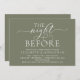 Modern romantisk kalligrafi, vit skrift, skogsgrön bakgrund, bröllopsinbjudan för middagsbjudning för bröllopsrepetition (med korttitel: kvällen före). Det är perfekt för er middagsbjudning för att fira er bröllopsrepetition, dagen före er stora dag. Lägg till era detaljer i matchande svart typsnitt / bokstäver.