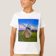 Fin kvarn som skapar ren energi i blå himmel med rosa moln i bakgrunden. Grönt gräs på den här söta lilla gården.