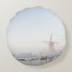 Runda dekorativ kudde av en kvarn i snön bredvid en kanal under en dimmig soluppgång i vinter i Nederländerna