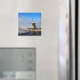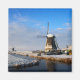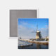 Fotomagnet från Souvenir med en kvarn bredvid en liten flod i solljuset från en vintermorgon i kallet i ett nederländskt landskap med snö i Nederländerna.