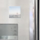Sövenirs kylmagnet av en kvarn i snö bredvid en kanal under en dimmig soluppgång på vintern i Nederländerna