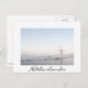 Ett vykort från en kvarn i snö bredvid en kanal under en dimmig soluppgång på vintern i Nederländerna med ett vitt gräns och texten: "Nederländerna".