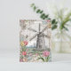 Shabby chic-teckningar av en rustisk kvarn omgivna av rosa tulpaner och vintage struktur, som kombinerar natur och nostalgi i en poetisk sammansättning.