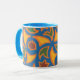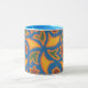 Ett vitt mugg med blått handtag och fälg, dekorerat med en geometrisk skärmbild med utskrift av vindkraftverk.