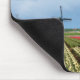 Mousepad med en landskap med en kvarn och gula och röda tulpan under en molnig himmel i den holländska bygden på en härlig springtimedag i kularegionen, Nederländerna.