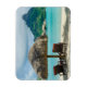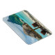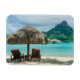 Rektangulär souvenir-magnet av en uppslammad parasol och två soluppstolar på en vit sandstrand i en lyxbukalow-resort över vatten i den blå lagunen av den pacifistiska ön Bora Bora, nära Tahiti i Fransk Polynesien.