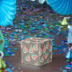 Kvarnbåtsprodukter med vismisk mönster, inklusive presentsäckar och presentlådor, party favors, kroppskuddar, ostskivor, keepsakes och andra föremål, segelbåtar med chevron rand och polka dots på grått-polka med prickad bakgrund.