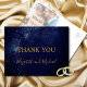 Guld, som ge intryck av stjärnor i himmel, skiner ovanför ord på blå bakgrund. Ett modernt tema för en kväll snyggt personligt bröllp tackar er. Ändra enkelt informationen till ditt eget anpassad design. Baksidan innehåller ett foto som är fäst så att ditt eget anpassningsbar-meddelande kan läggas till. Fotot visas också stilla. Visa samlingen vid Chessies Bra Design.