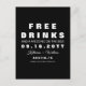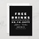 Kvick "FRIA DRINKAR OCH ETT BRÖLLOP bröllop spara datumvykort PÅ FÖR SIDAN" som knäcker upp dina gäster. Designen presenterar modern typografi med en antyda av skrivar stilsorten i vit på en svart bakgrund. På den bakre sidan av vykortet specificerar designsärdragalternativen för mer. Personifiera vykortet, genom att byta ut ta provtexten med ditt, specificerar.