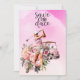 Kvinna golfer med rosa golfvagn på rosa inbjudningar