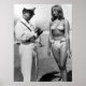 Vintagens svarta och vita fotografi av en kvinna i en bikini som ges biljett av en polisman.