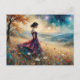 Ung kvinna i en färggranat gryga, står på en backe av blommor i ett vackert landskap AI-konst skapat med minx267