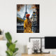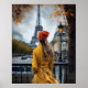 Kvinna i Gult Bathrobe Admiring Eiffel Torn Poster