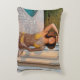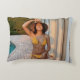 Kvinna i gult bikini som står på brunt brickflo prydnadskudde