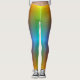 Kvinna i regnbågsfärgade byxor med ett subtilt mönster, från orange i midjan till blå vid anklarna. Hon bär svarta sneakers, vilket ger en livfull, dynamisk stil.