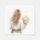 En ung kvinnas vattenfärgskonst med en daisy bukett på vit bakgrund.