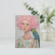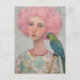 En kvinna med rosa hår som bomullssocker och hennes husdjur fågel på axeln i en stil av en blandteknikmålning