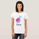 Kvinna skjorta har en vitbakgrund. Designen inkluderar färgerna svärtar, rosor och turkos.