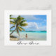Ett vykort från en kvinna i bikinis under ett hängande handflatan träd i det grunda vatten i lagunen vid stranden på en tropisk ö i Fransken Polynesien för den pacifistiska skärgården med ett vitt gräns och texten: "Bora Bora".