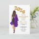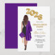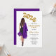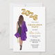 Inbjudan till examensfest för afroamerikansk kvinna 2026. Inbjudan till examensfest med kvinnlig porträttteckning i svart klänning, lila examenshatt och - kappa, långt mörkt hår. Klass 2026 gyllene ballonger.