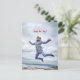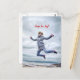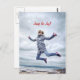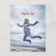 Uppmjukande serie: Ett underbart vykort med ett foto av en kvinna som hoppar av sten på en strand. Hennes arm och ben är delvis utsträckta och förvandlar det till ett krabbhopp. Hon bär en stoppad jacka mot kallet och hennes hår lyfter i vinden. Med ett uttryck för lycklig och ögon i stort är det övergripande intrycket vildens överseende. Bildkod: hrcol149