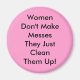 Kvinnor Messes är inte en humoristisk produkt från påstående. Detta belyser det faktum att kvinnor inte behöver städa upp någon annans . Tyvärr kan många kvinnor fortfarande relatera till att de ofta lämnas städning efter andra. Om ni är en av de kvinnor som kan relatera till detta, då kan ni uppskatta humor i påstående.