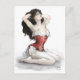 En mörk var en kvinna i en rödkorsett och vita bojor strejkor en klassisk stift-up-tjej.