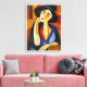 Det här är en målning av en kvinna med hatt i ett modernt stil. Kvinnan bär en svart hatt och en blå blus med en röd halsduk. Bakgrunden består av varma toner i ett geometriskt mönster. Målaren användor färg och linjer med fetstil för att skapa kontrast och intresse. Den här målningen skulle göra ett underbart tillägg till alla konstsamlingar eller som påstående biet i ett rum. Den kan också tryckas på olika produkter som t-shirts, telefonfodral etc.