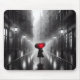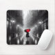 Silhouette från en kvinna som går på en mörk regnstadsgata med ett rött paraply i selektiva färg