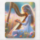 En vacker ung kvinna som spelar en harp i en fält av vilda blommor