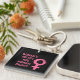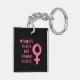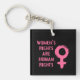 Nyckelkedja med feministiskt budskap, med rosa kvinnlig symbol och "Kvinnors höger är mänskliga höger" text i stil-penselns typsnitt